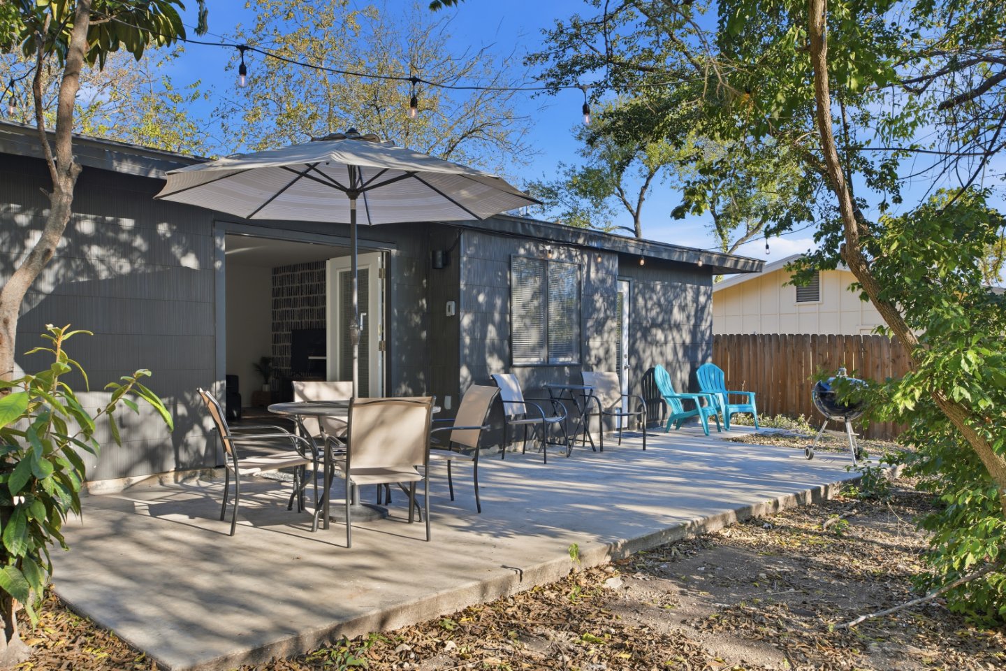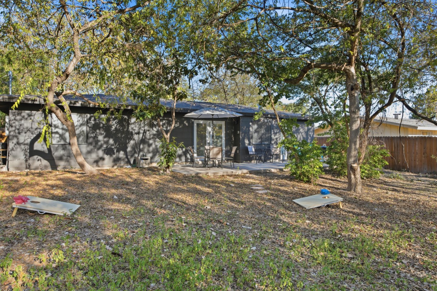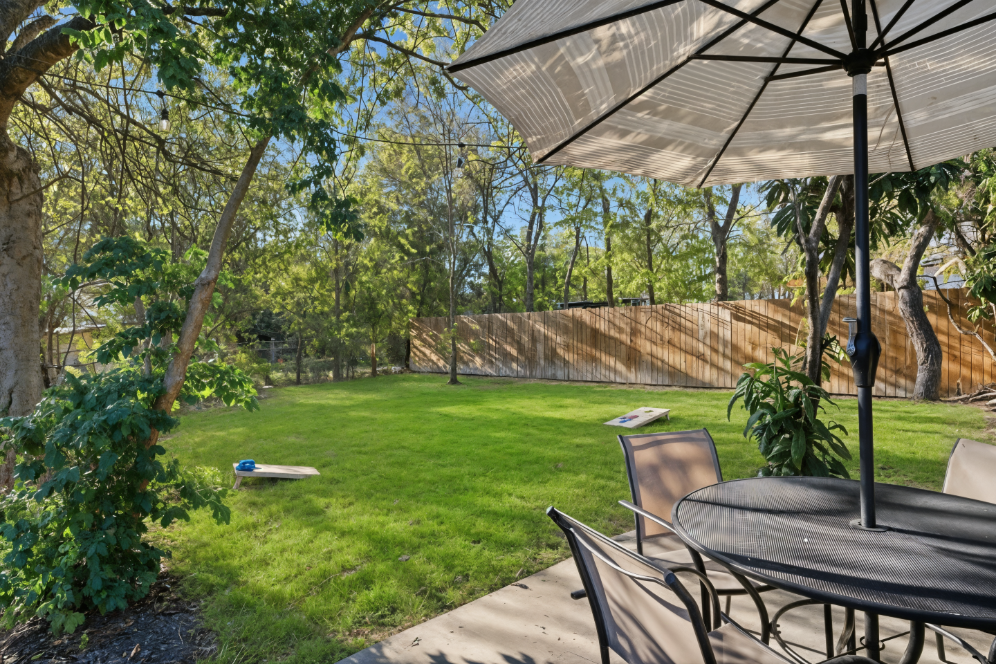 The private, fenced backyard is perfect for slow mornings or breezy Texas evenings. Fire up the grill, play a round of cornhole, or enjoy quiet time under the mature oak trees that inspired the home’s name.