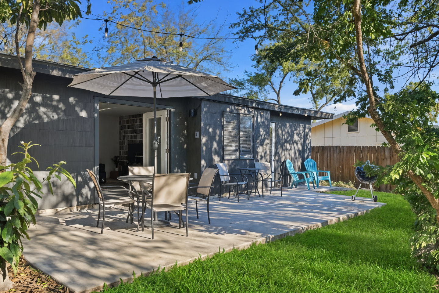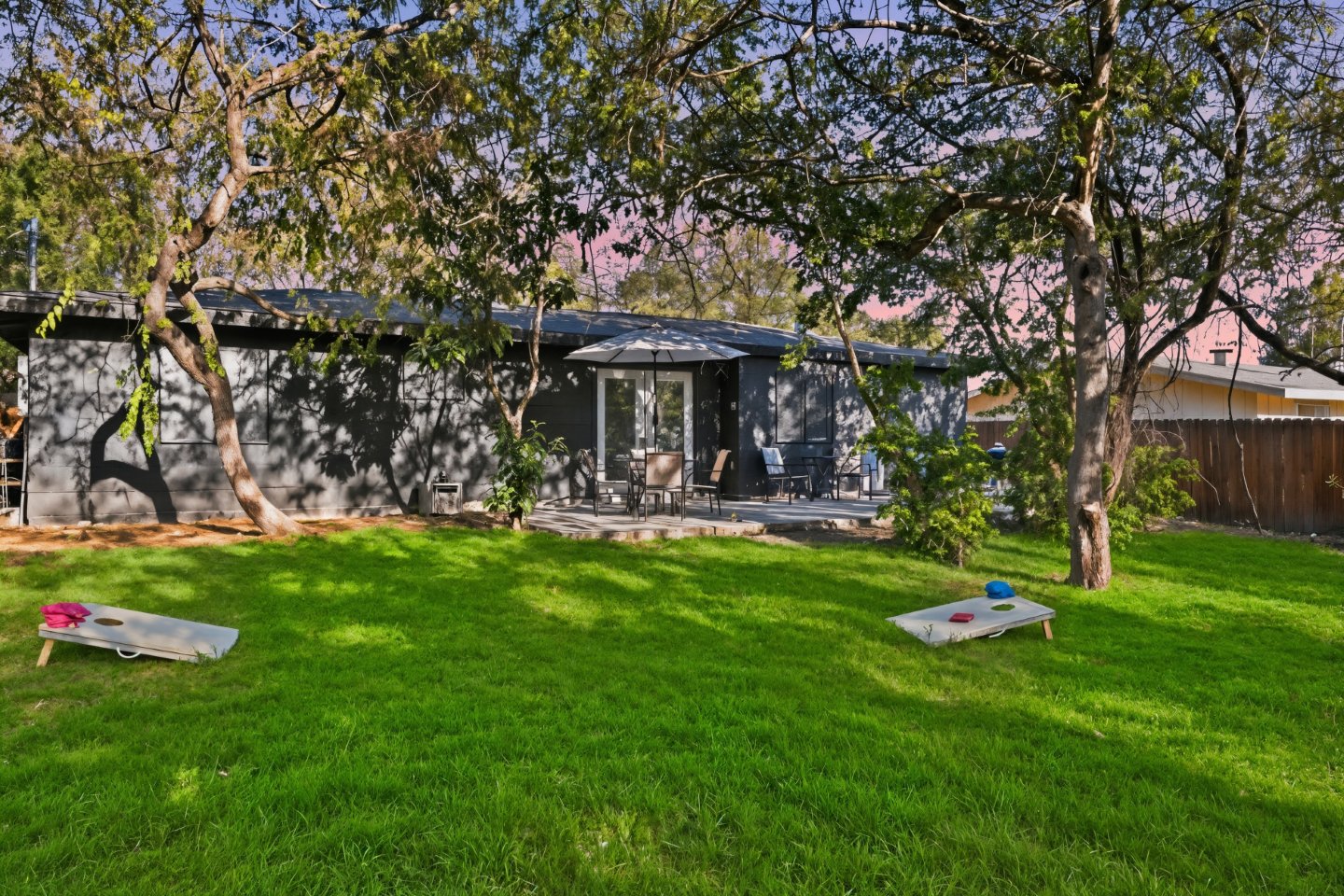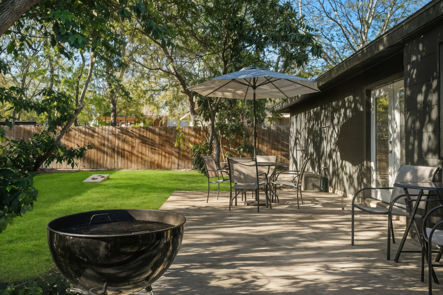 The private, fenced backyard is perfect for slow mornings or breezy Texas evenings. Fire up the grill, play a round of cornhole, or enjoy quiet time under the mature oak trees that inspired the home’s name.