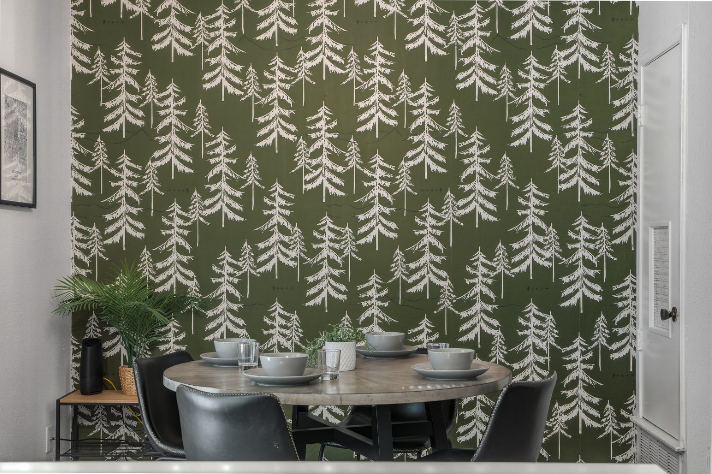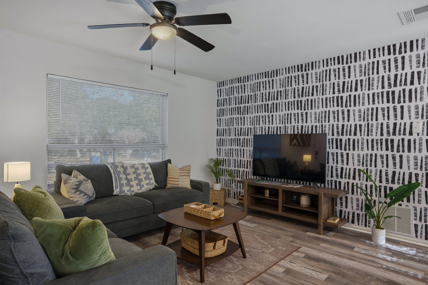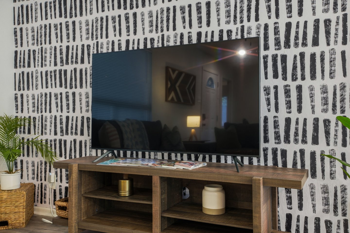 Step inside and you’ll find an open-concept living area with a large sectional, Smart TV, and soft lighting—ideal for gathering, streaming your favorite shows, or simply unwinding after a day in the city. The design blends dark, modern tones with natural textures, creating an atmosphere that’s equal parts chic and comfortable.