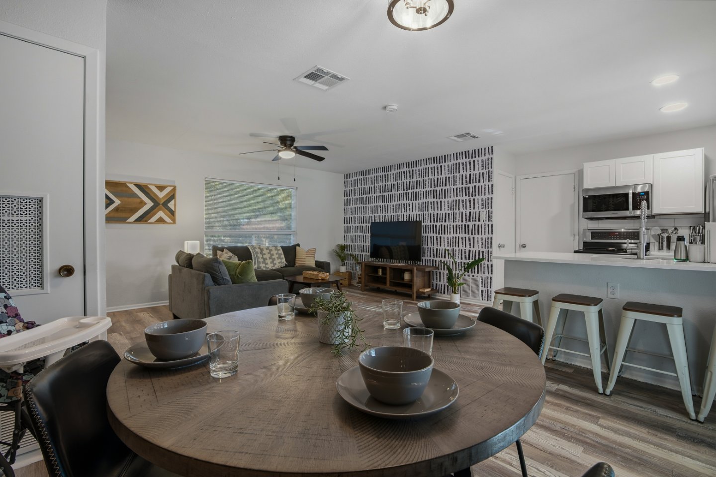 The spacious kitchen makes home-cooked meals a breeze. Enjoy stainless-steel appliances, full cookware, utensils, and a Keurig coffee maker with pods ready to go. Whether you’re preparing breakfast before heading out or grilling dinner on the back patio, this space is designed for easy dining and togetherness.